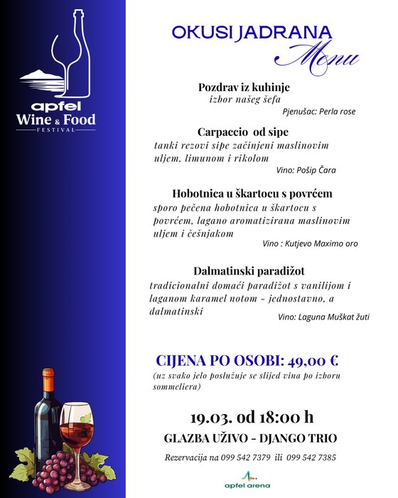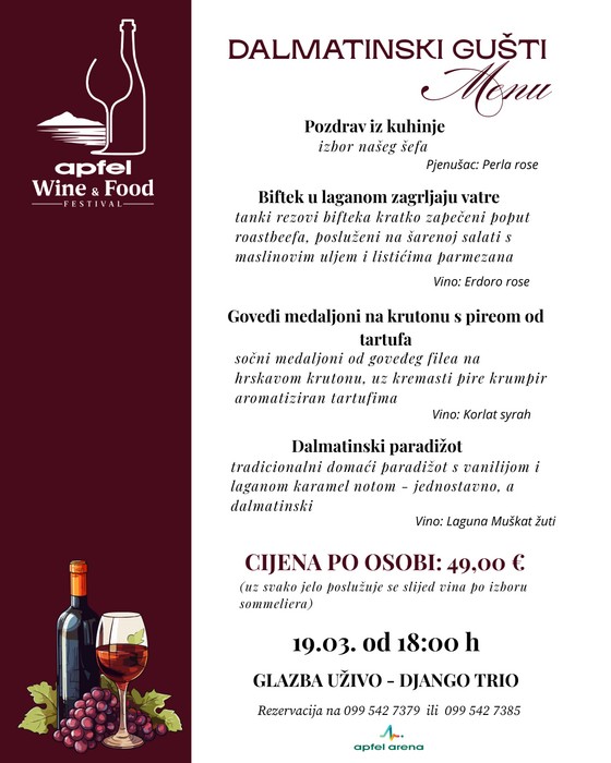 U četvrtak, 19.3. od 18 sati, u Apfel Areni očekuje vas posebna Dalmatinska gastro večer uz glazbu uživo. Za odličnu atmosferu pobrinut će se svima omiljeni Django trio.
